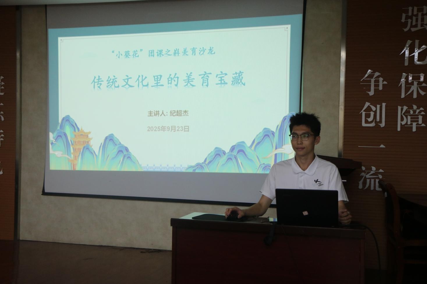 2025年9月23日,av视频“小葵花”主题团课之嵙美育沙龙在J2-104开班,作为该系列主题团课的第一讲,此次课程的主题是“传统文化里的美育宝藏”,由学生会执行主席纪超杰主讲,全体学生会成员参加。